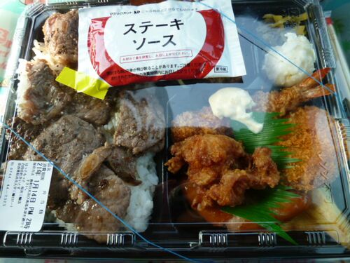 スペシャル洋風バラエティ弁当 デミソースをかけたプチハンバーグ、エビフライ、から揚、メンチカツ、ウィンナー、 カットポテトと、人気の多彩なおかずを盛り付けました。 さらに、ごはんの上にカットステーキ1人前をのせた贅沢なお弁当です。 税込み890円 …