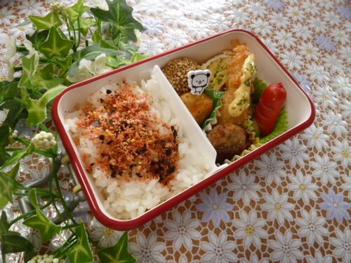 昨日の夜は寒いくらいでしたね~。 よく眠れました。 暑いと寝つきが悪いですが、涼しいと寝つきがいい! ず~っとこれくらいの気候だといいのにね~。 ご飯に明太ふりかけをトッピングしました。 おかずは、ネギ入りたまご焼き、赤いウインナー、レモンの唐…