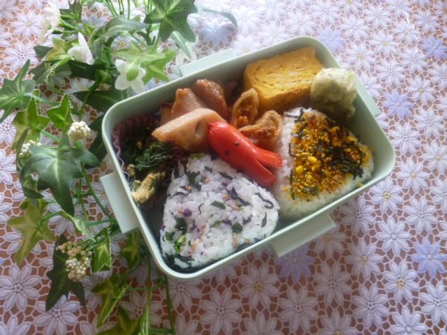 2023-04-18 お握り弁当 お弁当 昨日の夜は寒かったですね~。 ひざ掛けが大活躍でした。 お握りは、若菜とひじき&のりたまでした。 おかずは、たまご焼き、たこさんウインナー、ちくわの磯部揚げ チーズカレー春巻き、鶏の照り焼き&蓮根ソテー、ほうれん草の卵炒めでした。 新しいドラマが始まっていますね~。 これから見るのが楽しみです(^^) ランキングに参加中♪クリックしていただると励みになります!