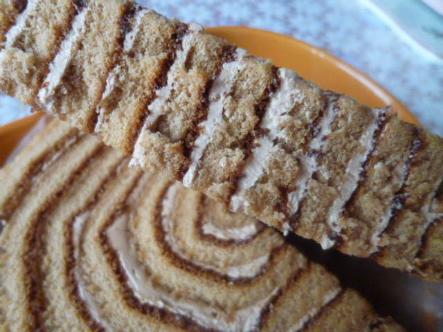 コーヒーホイップクリームを巻いた、コーヒー風味のロールケーキ。
